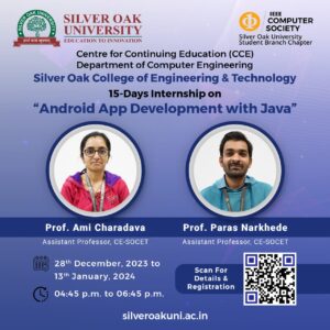 Department of Computer Engineering at Silver Oak College of Engineering & Technology, in collaboration with Silver Oak University IEEE Computer Society Student Branch Chapter, successfully conducted a 15-days internship on "Android App Development with Java." The initiative, organized under the Centre for Continuing Education (CCE), aimed to equip students with practical skills in Android app development.