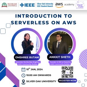"Introduction to Serverless on AWS" was a remarkable event meticulously organised by Silver Oak University IEEE Student Branch in collaboration with AWS Cloud Clubs at Silver Oak University and Department of Computer Engineering, SOCET. This event aimed to unravel the transformative potential of serverless within the AWS ecosystem. It served as a focused platform to delve into the intricacies of serverless computing, offering insights specifically tailored within AWS.