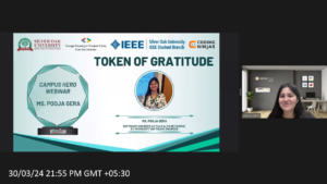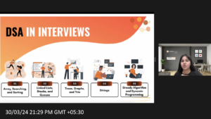 She presented a comprehensive plan for DSA practice, covering a wide range of topics commonly encountered in technical interviews. From arrays and sorting algorithms to dynamic programming and greedy algorithms, she provided practical advice on mastering these concepts. Afterward, the session moves forward with expressions of gratitude from IEEE SOU SB and GDSC SOU to Ms. Pooja Gera, the virtual memento highlighting her success in delivering invaluable insights for aspiring professionals in the tech industry.