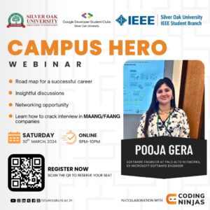 Silver Oak University IEEE Student Branch organized a collaborative event titled "Campus Hero Webinar" in partnership with Google Developer Student Clubs Silver Oak University and Coding Ninjas. The event aimed to provide participants with valuable insights into building successful careers, cracking interviews in top-tier companies like MAANG/FAANG, understanding industry-level topics such as Programming languages, Data Structures and Algorithms (DSA), and leveraging networking opportunities.