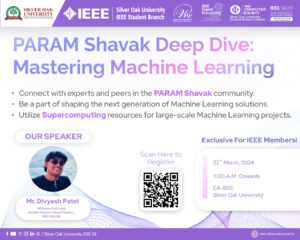 Silver Oak University IEEE Student Branch orchestrated a remarkable event titled "PARAM Shavak Deep Dive: Mastering Machine Learning". This event was meticulously crafted to immerse participants into the intricate world of PARAM Shavak, delving into the realms of supercomputing. The primary aim of the event was to illuminate the prowess of ML algorithms and the transformative potential of computational power.